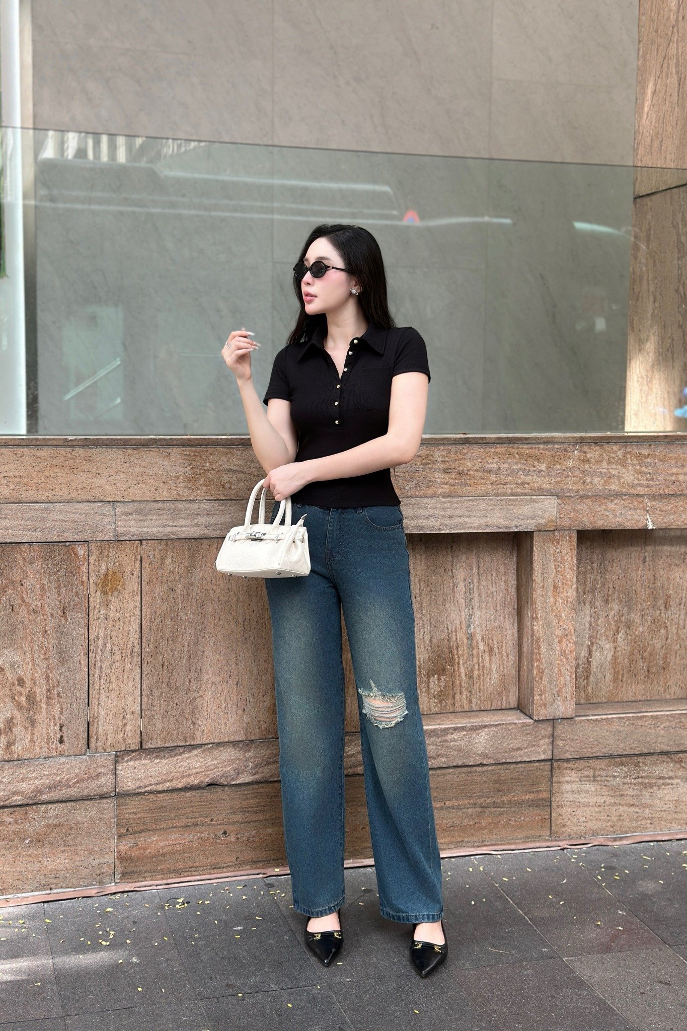 Form: Áo thun kiểu, form ôm, đắp vạt thân trước, tay dài ôm.